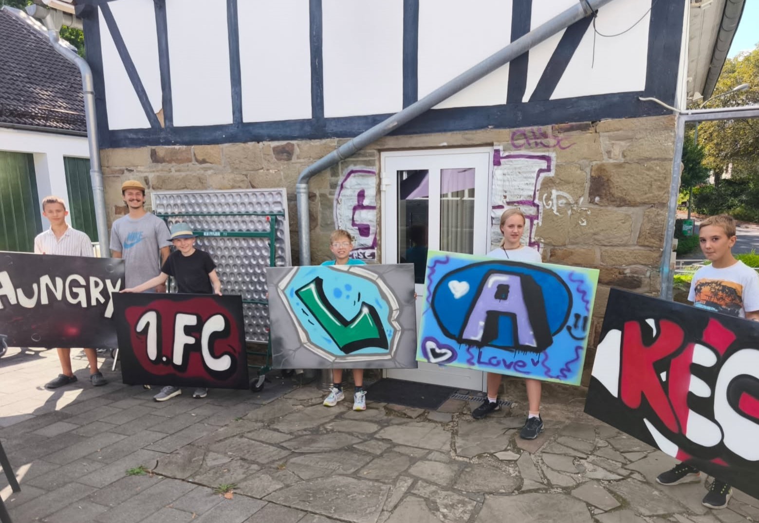 Neben einigen "Klassikern" im Ferienprogramm hatten wir dieses Jahr auch ein paar Neuheiten im Angebot. Hierzu zählte zum Beispiel das Grafitti-Projekt an einem Bauwagen des Technik- und Bauernmuseums in Much Berzbach. Beim Instrumentenkarussell mit Paul Radau, Stefan Ludmann und Peter Macherey konnten die Jugendlichen Schlagzeug, Keyboard, Gitarre, Saxophon und Flöte ausprobieren. Hier war also für jeden etwas dabei. Viele Jugendliche haben sich zudem gefreut an unserem großen Ferienfrühstück teilzunehmen bei dem alle TeilnehmerInnen einzelne Aufgaben für die Zubereitung übernommen haben. Zudem gab es noch einen Kinonachmittag, Nähen mit Julia Tossenberger, "Open Roberta" (Roborter programmieren) und Eierfärben mit Gilda und Thomas aus dem Juze Team.